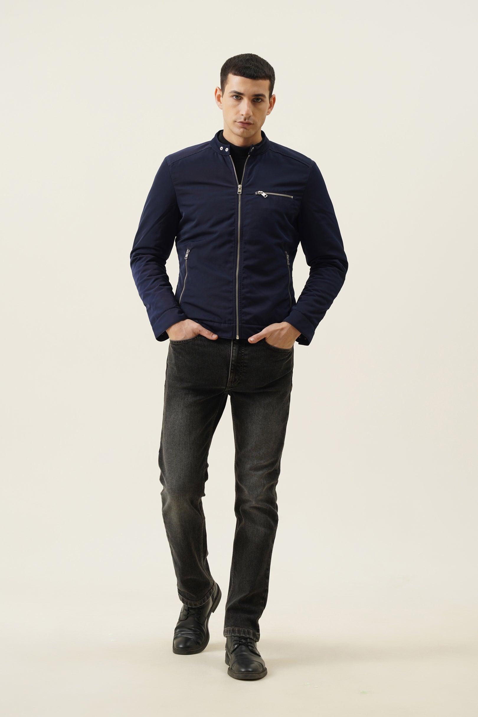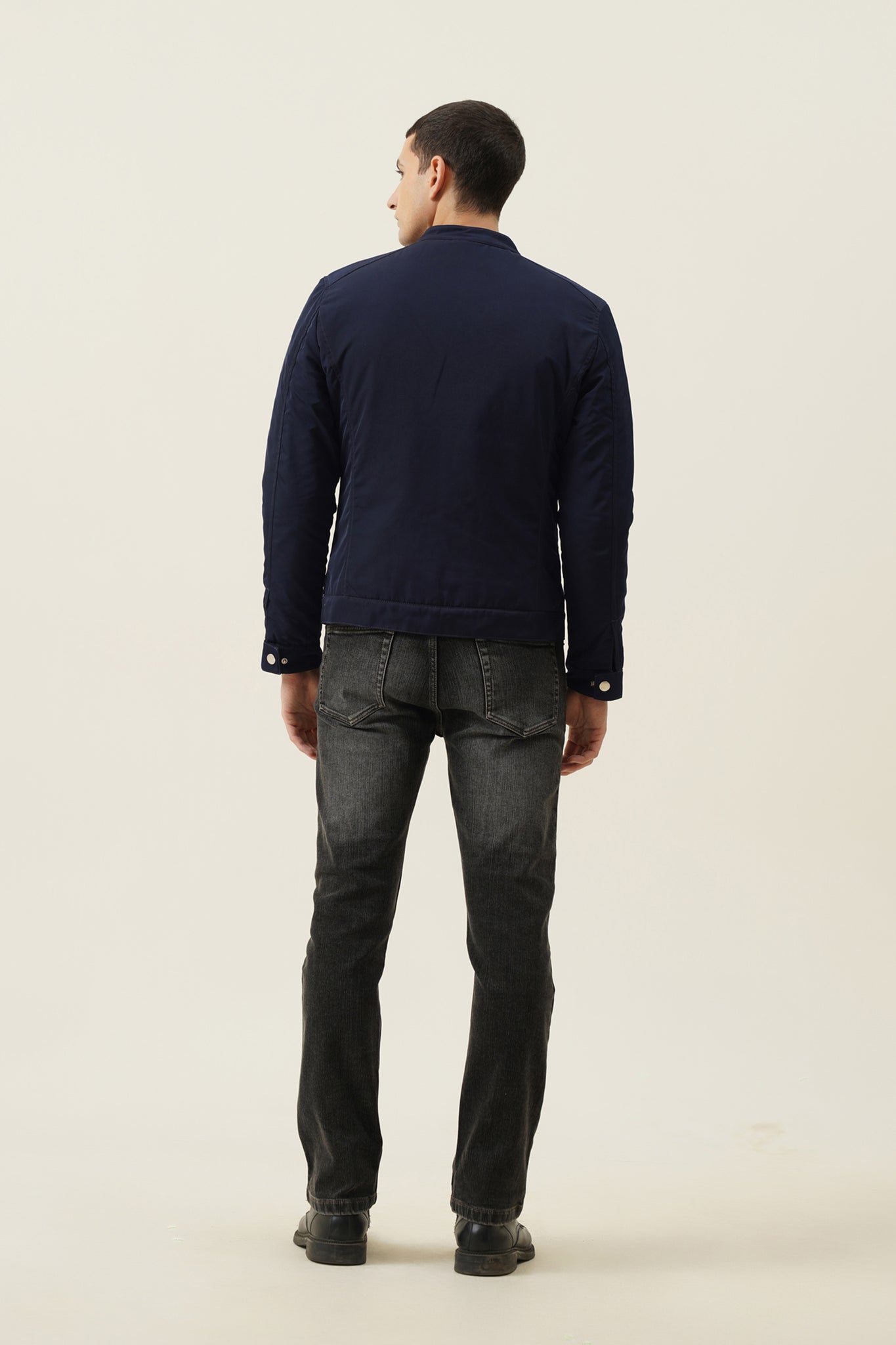 Designed with a stand collar and snap button closure, metal zipper detailing, and three functional front pockets, this jacket channels a sharp, biker-inspired vibe while maintaining the comfort and practicality of a bomber silhouette.