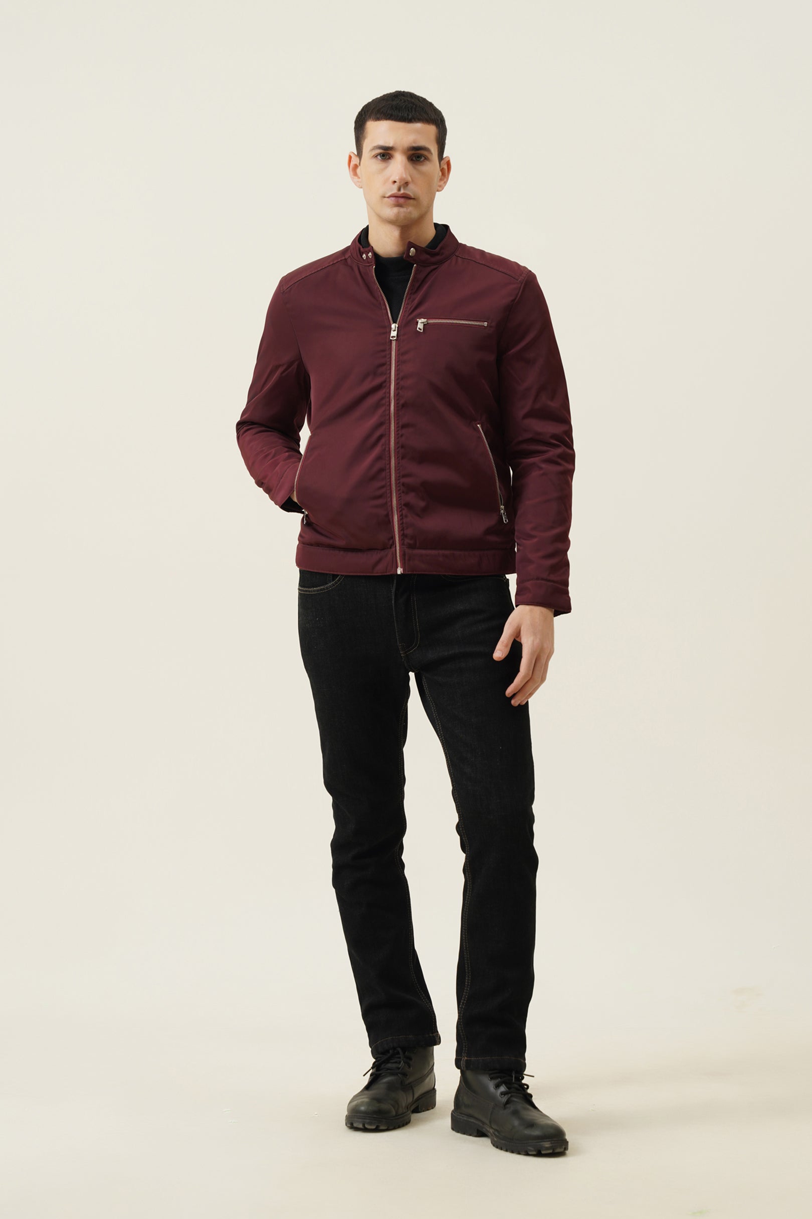 Designed with a stand collar and snap button closure, metal zipper detailing, and three functional front pockets, this jacket channels a sharp, biker-inspired vibe while maintaining the comfort and practicality of a bomber silhouette.